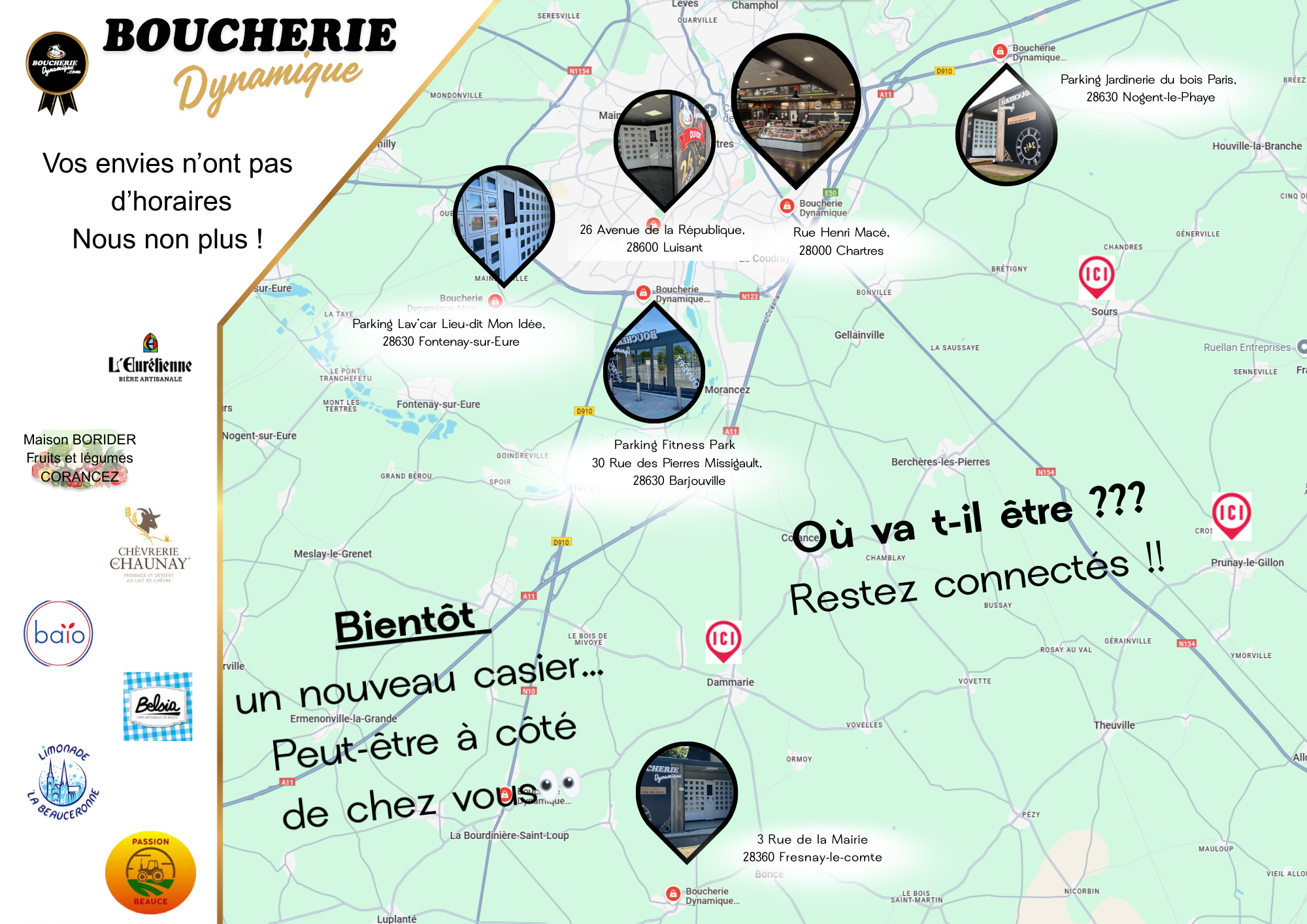 Nos casiers sont installés dans plusieurs communes d'Eure et Loir avec de nouvelles implantations prévues prochainement afin de renforcer la proximité.